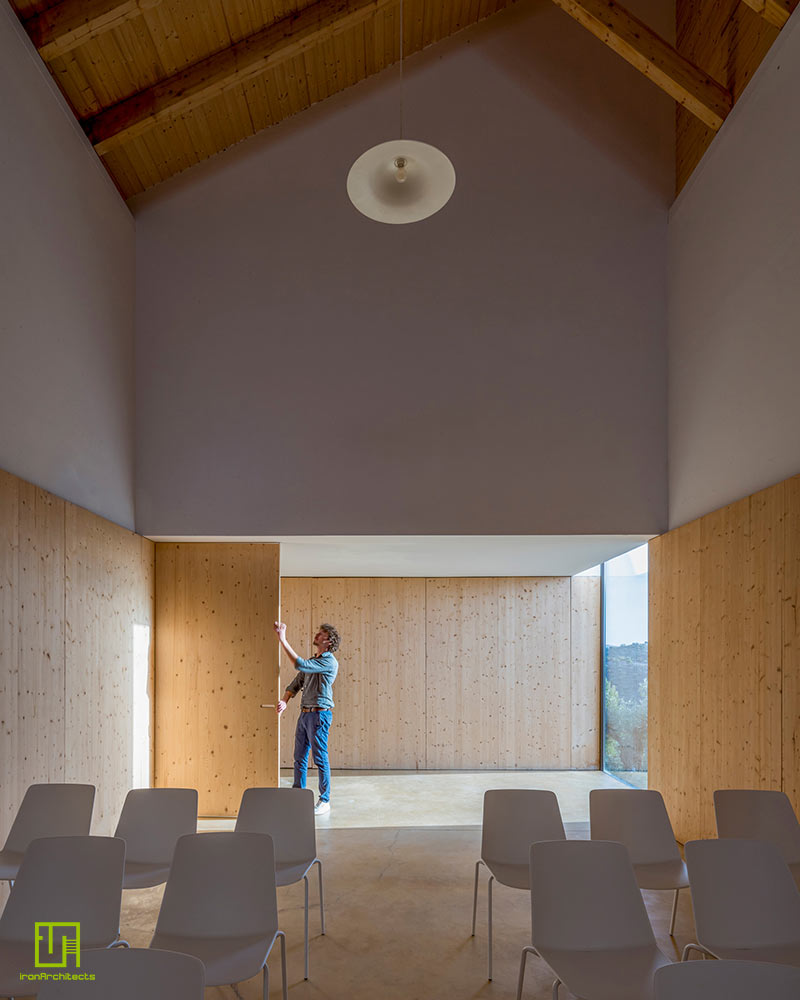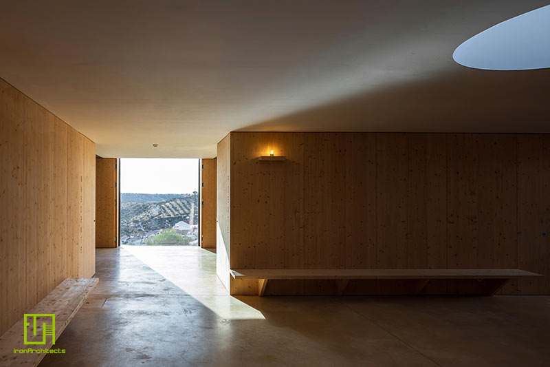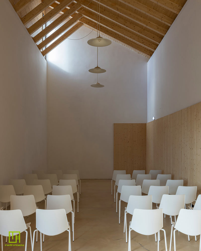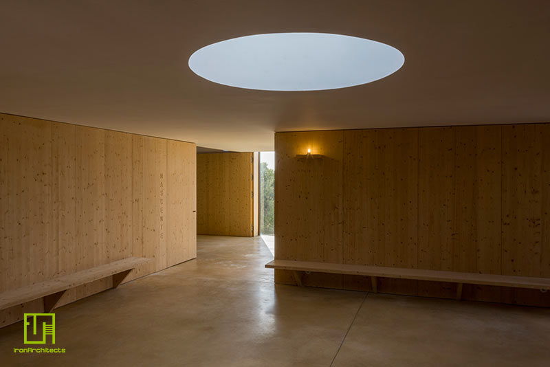 فضاهای داخلی بر اساس توپوگرافی زمین شکل گرفتهاند و محیطهایی آرام و متناسب با نیاز به سکوت و دروننگری فراهم میکنند. اتاق انتظار در طبقه همکف نقش مرکز سازماندهنده را دارد و فضاهای عمومی را از بخشهای خدماتی جدا میسازد. علاوه بر این، سیستم درهای کشویی در نمازخانهها انعطافپذیری زیادی ایجاد میکند. به کمک این طراحی، امکان برگزاری همزمان یا جداگانه مراسم تدفین وجود دارد و نیازهای مختلف جامعه پاسخ داده میشود.