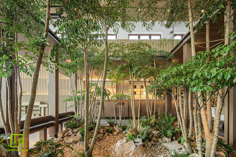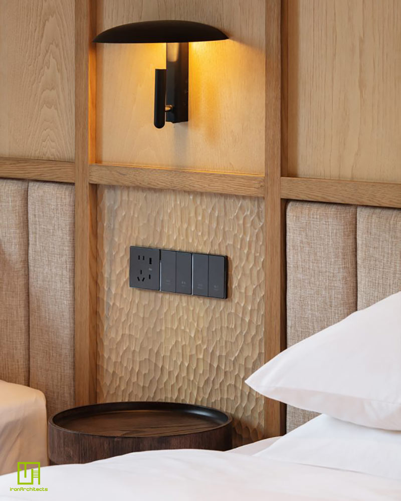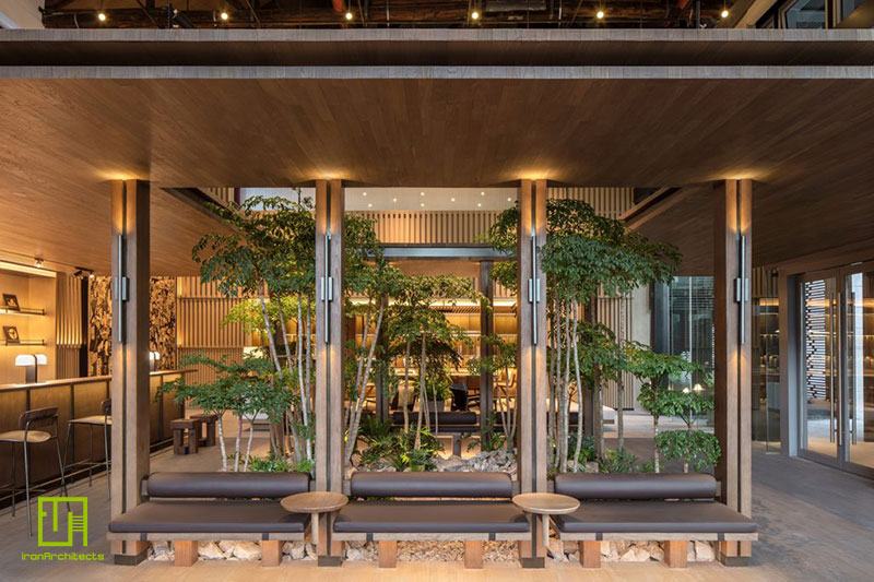لابی هتل در سالن سابق سینما جای گرفته و ساختار سقف چوبی اصلی حفظ شده تا ارتفاع و شکوه داخلی فضا همچنان محسوس باشد. یک صفحه نمایش جدید به گذشته سینمایی ساختمان اشاره میکند و حوضچه مرکزی با درخت و راهرو، یادآور حیاطهای باغهای سنتی یانگژو است. چوب کهنسال درخت اُلم، کفپوش سنگ طبیعی و روکش چوب ارهای، پالت لمسی فضا را شکل میدهند و حال و هوای سینماهای تاریخی را بازسازی میکنند.