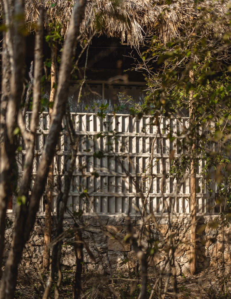 ساختمان بر روی پایههایی از سنگ محلی و در ارتفاع یک متری از سطح زمین قرار گرفته است. این تصمیم، هم پاسخی اقلیمی برای مقابله با سیلابهای فصلی است و هم راهکاری برای تهویهی متقاطع و خنکسازی طبیعی. مصالح بومی و روشهای سنتی مایایی در ساخت بنا به کار گرفته شدهاند تا پیوند میان معماری و زمینهی فرهنگی حفظ شود.