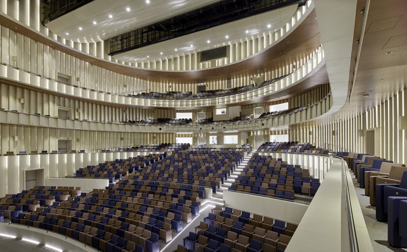 فضای داخلی تالار به شدت تحت تأثیر پوسته خارجی آن قرار دارد. نوری که از میان نقوش خوشنویسی عبور میکند، فضایی با نور «لکه لکه» و پویا ایجاد میکند که با یک نورگیر سقفی در اوج گنبد به کمال میرسد. هسته اصلی بنا، یک سالن تئاتر چندمنظوره با ظرفیت حدود ۱۶۰۰ صندلی است که برای رویدادهای مهم دانشگاهی مانند جشنهای فارغالتحصیلی و اجراهای فرهنگی طراحی شده است. فرم کروی بنا چالشهای آکوستیکی قابل توجهی ایجاد میکند که با استفاده هوشمندانه از سطوح پخشکننده و جذبکننده صدا، که در معماری داخلی ادغام شدهاند، مدیریت شده است.