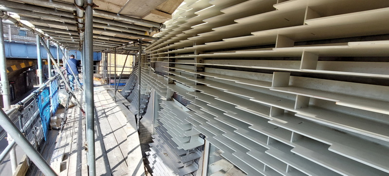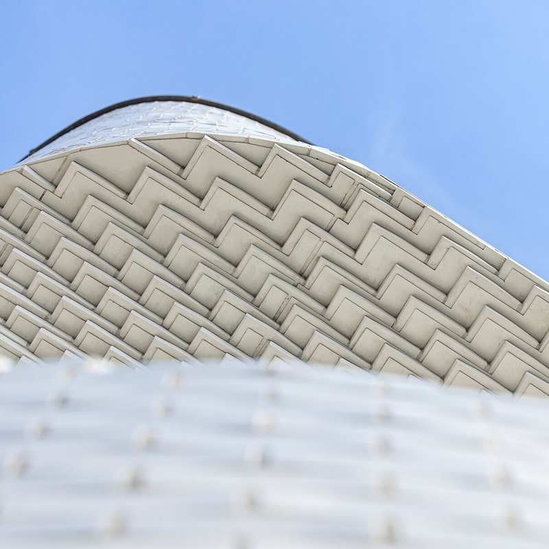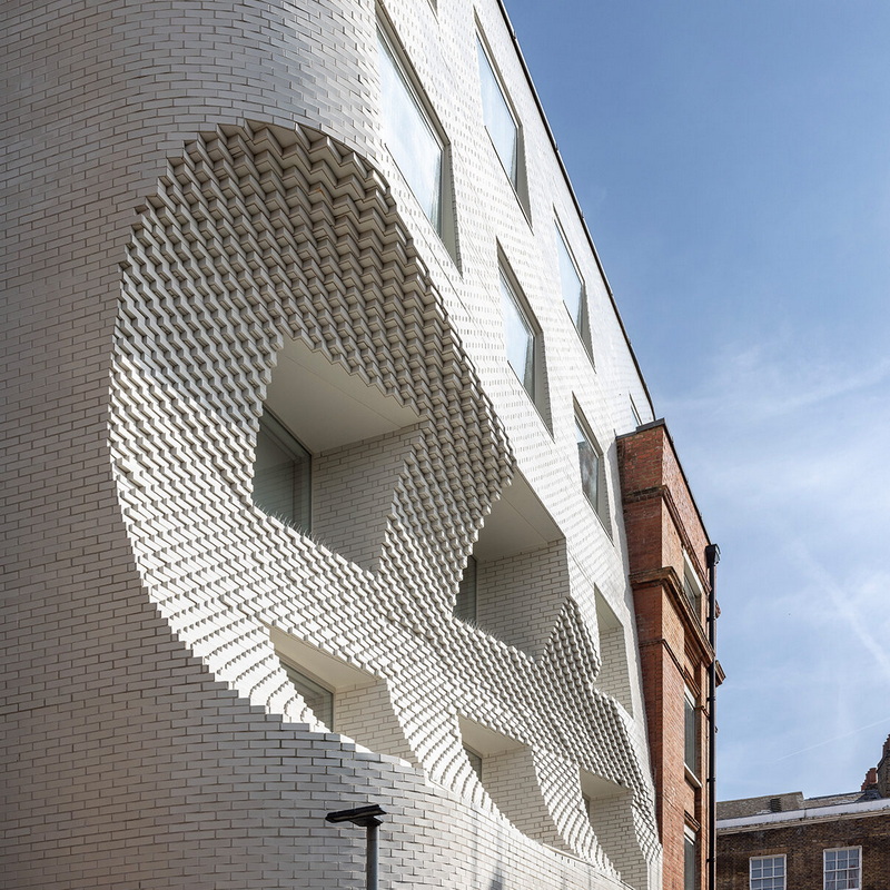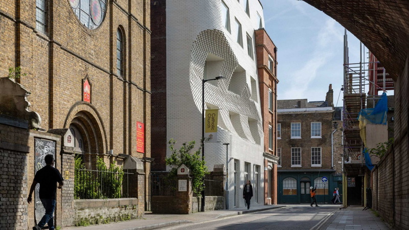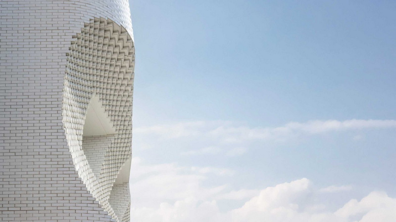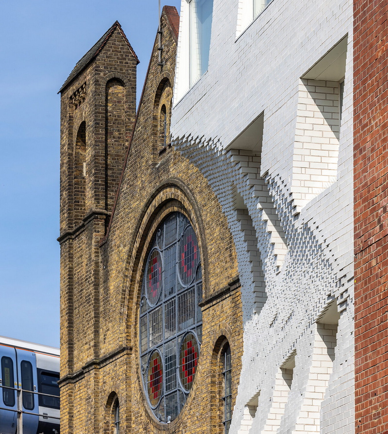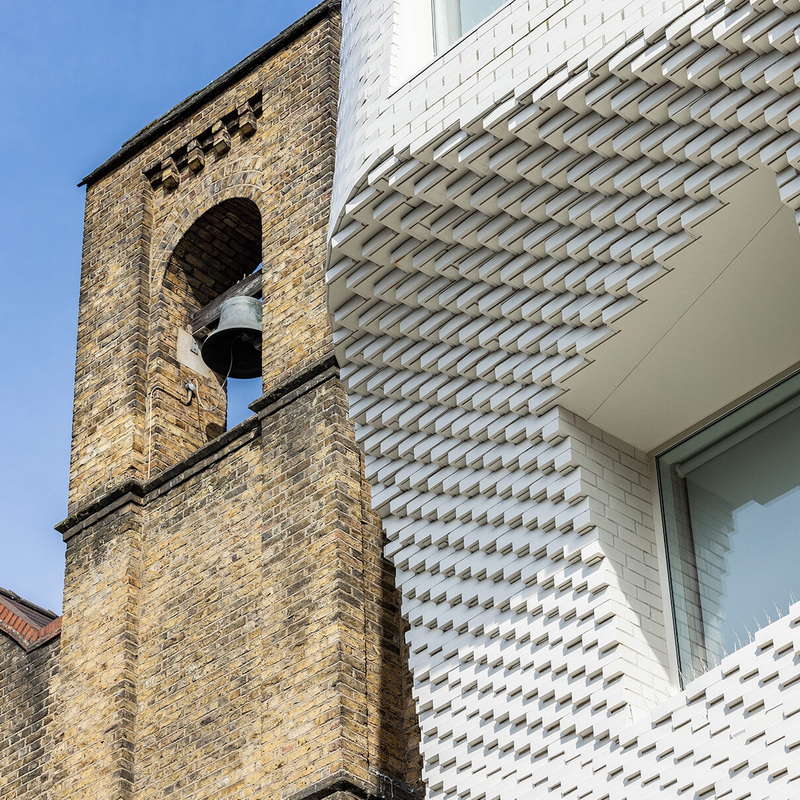 شاخصترین ویژگی ساختمان، نمای منحصربهفرد آن است که از آجرهای رسی با لعاب سفید ساخته شده است. این انتخاب، تضادی چشمنواز با آجرکاری تیره و سنتی کلیسا و بافت اطراف ایجاد کرده و به ساختمان هویتی روشن، مجسمهگون و کاملاً مدرن میبخشد. تیم طراحی با استفاده از مدلسازی سهبعدی و ابزارهای پارامتریک، موقعیت هر آجر را با دقت میلیمتری مشخص کرد. برای پشتیبانی از این دیوار آجری معلق، یک سیستم سازهای پنهان از فولاد ضدزنگ، توسعه یافت که در آن هر آجر روی یک قفسه فلزی مجزا قرار میگیرد.
