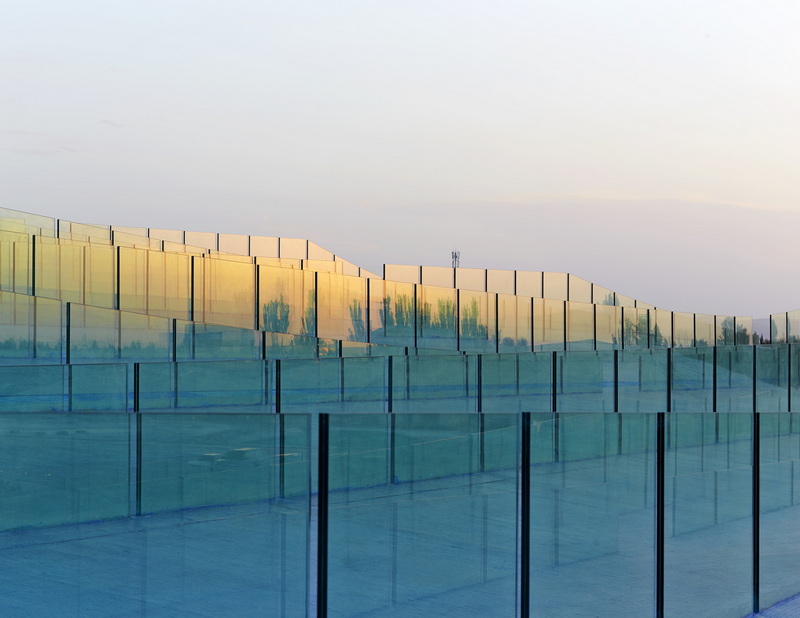 استفاده از موزاییکهای شیشهای با طیفهای آبی و سبز، به رنگدانههایی اشاره دارد که بهصورت تاریخی در فِرِسکهای غارهای موگائو بهکار رفتهاند، در حالی که صفحههای سقفی همپوشان جزئیات سازهای را میپوشانند و سطحی یکپارچه و بازتابدهنده ایجاد میکنند. نور و سایه در طول روز ساختمان را زنده میکنند و اغلب اثراتی شبیه سراب خلق میکنند که مرز بین فرم ساختهشده و افق بیابان را محو میسازد. این یکپارچگی پدیدههای بصری، گفتوگوی تئاتر با محیط پیرامونش را تقویت میکند.