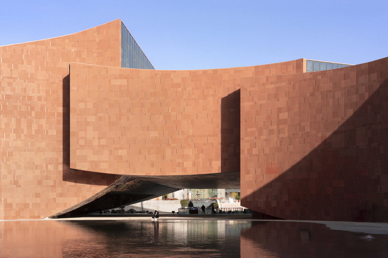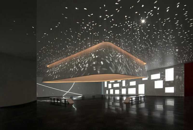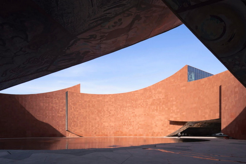 در ورودی غربی ساختمان، دو حجم متقاطع، فضایی نیمهباز ایجاد کردهاند که بهعنوان آستانهای نمادین عمل میکند. درون این فضا، حیاط مرکزی و سقفی نقاشیشده قرار دارد که از نقاشیهای دیواری باستانی غارهای کوه مایجی الهام گرفته و بر صفحات فلزی رنگشده اجرا شده است. از این نقطه، مسیر بازدیدکنندگان در جهت عقربههای ساعت آغاز میشود؛ مسیری مارپیچ که از شش بخش اصلی میگذرد: پذیرش، تالار مقدماتی مایجی دیجیتال، سینمای پنجبعدی، لابی تئاتر، فضاهای نمایشگاهی و تفریحی، و مرکز فرهنگی–خلاق. این توالی، تجربهای پیوسته و منسجم از هنر، فرهنگ و فناوری ارائه میدهد.