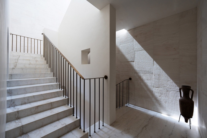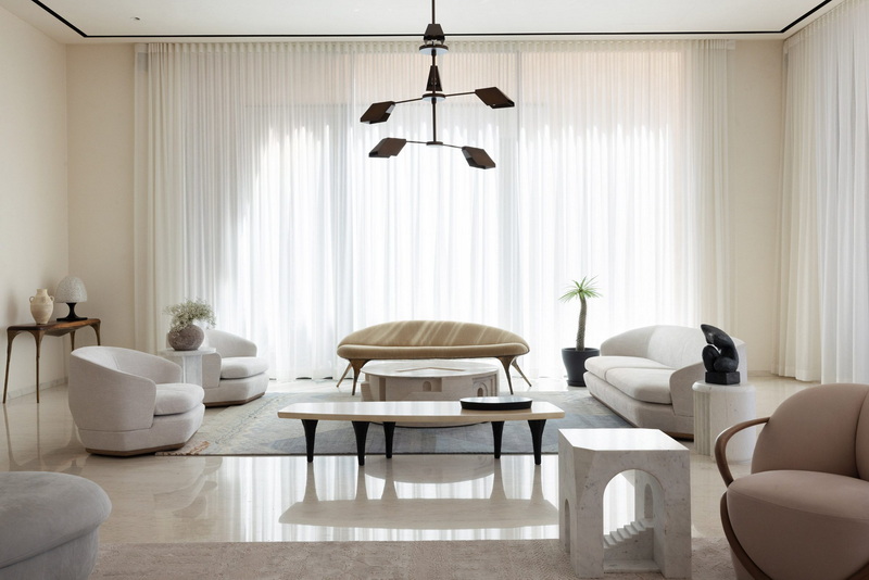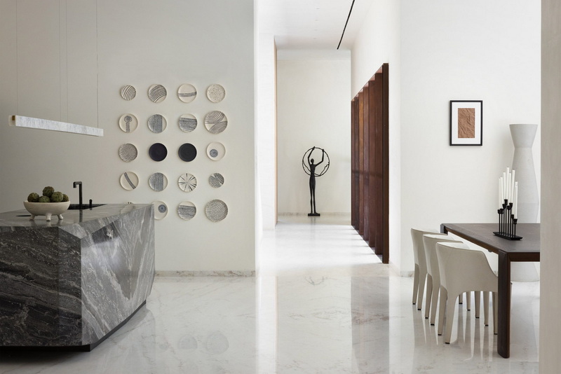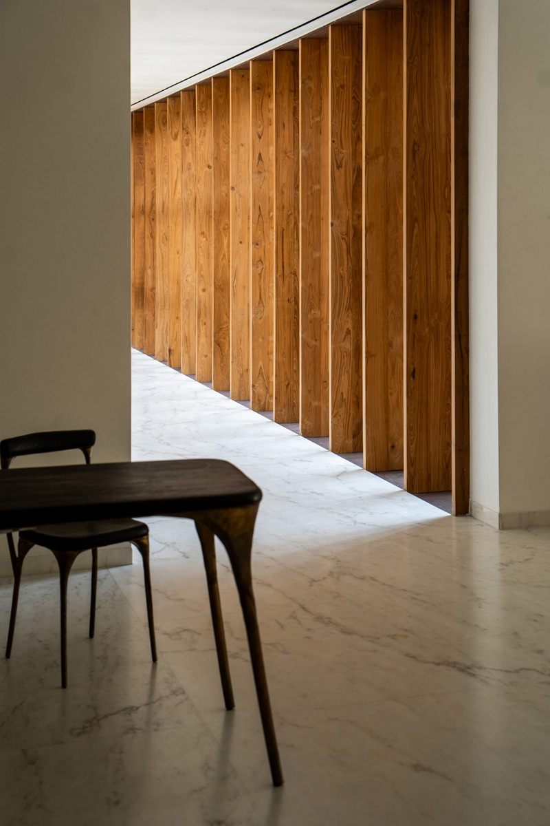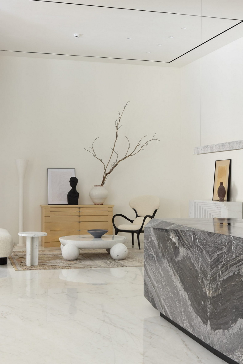 در اکثر بخشهای داخلی، کفپوش مرمر سفید به کار رفته است. استودیو با محدود کردن تنوع مصالح، بر حفظ سادگی و تعادل فضایی تأکید کرده است. آنها میگویند: «تنوع مصالح را به حداقل رساندیم تا تجربهای متعادل در فضاهای داخلی ایجاد شود. چالش اصلی پرهیز از اغراق در طراحی و انتخاب مصالح بود تا خلوص و سادگی زبان معماری حفظ شود.»