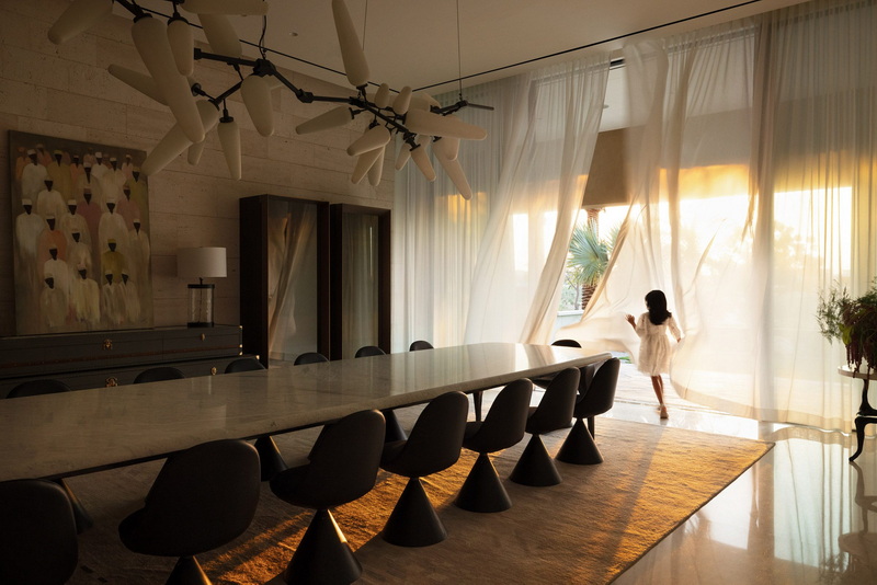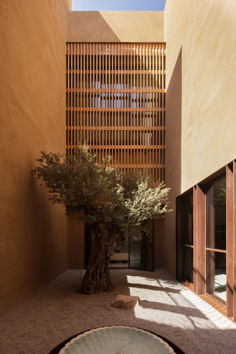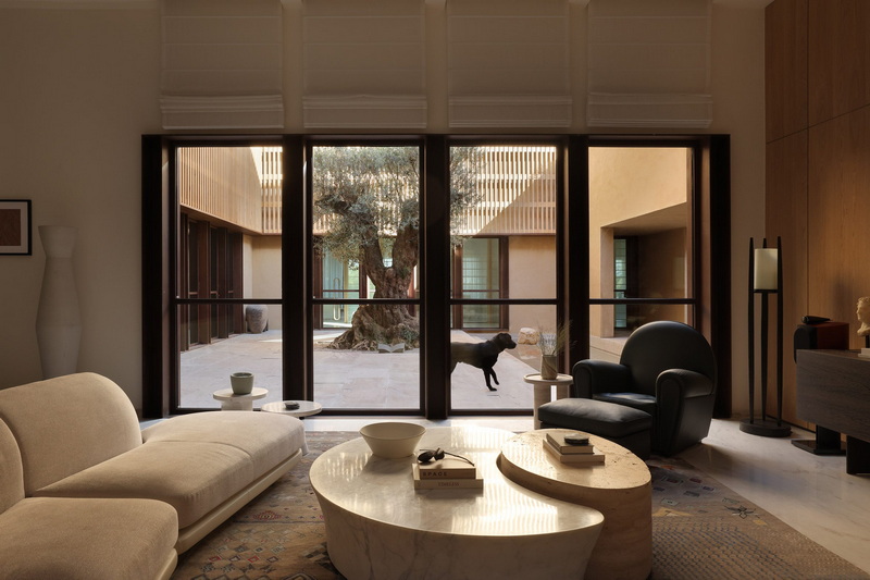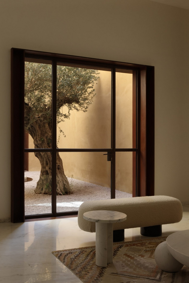 استودیو تأکید کرد: «محوطهسازی با رویکردی بومی انجام شد و تمرکز ما بر استفاده از گیاهانی چون ساکولنتها، نخلها و درختان زیتون بود. درختان زیتون تمامی حیاطها را آراستهاند و به شکلی نمادین، کل خانه را به یکدیگر پیوند میدهند.»