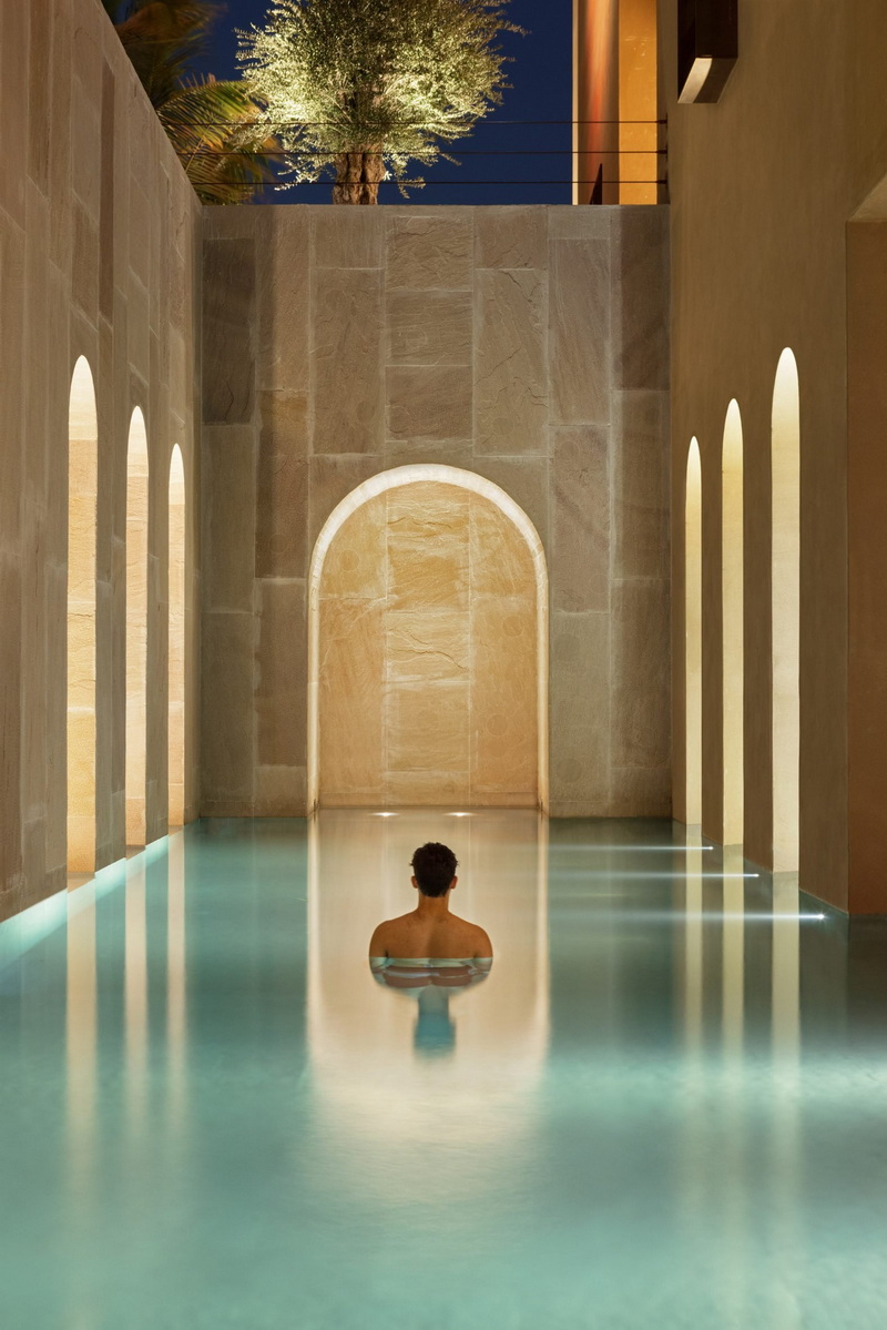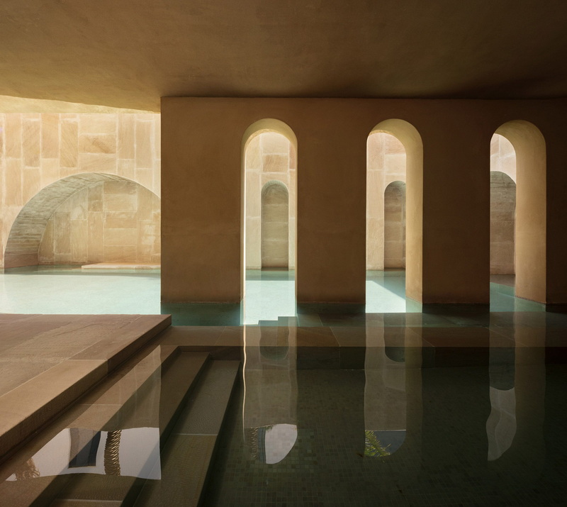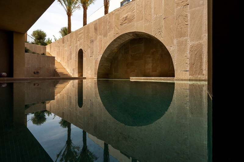 در میان قسمتهای مختلف خانه، مجموعهای از حیاطها و فضاهای خالی در تمام طبقات، طراحی شده است. برخی از این حیاطها دارای آبنما و استخرهایی با محوطهسازی چندسطحی هستند که با سنگ ماسهای هندیِ دستتراش ساخته شدهاند.