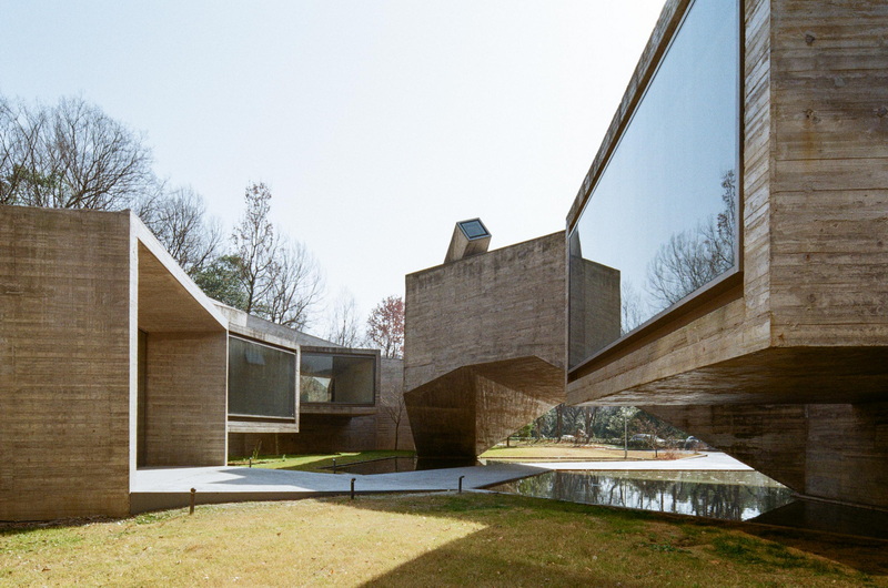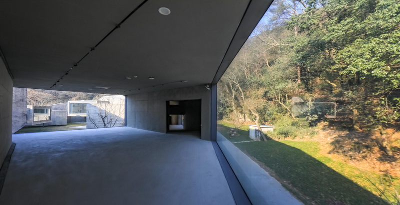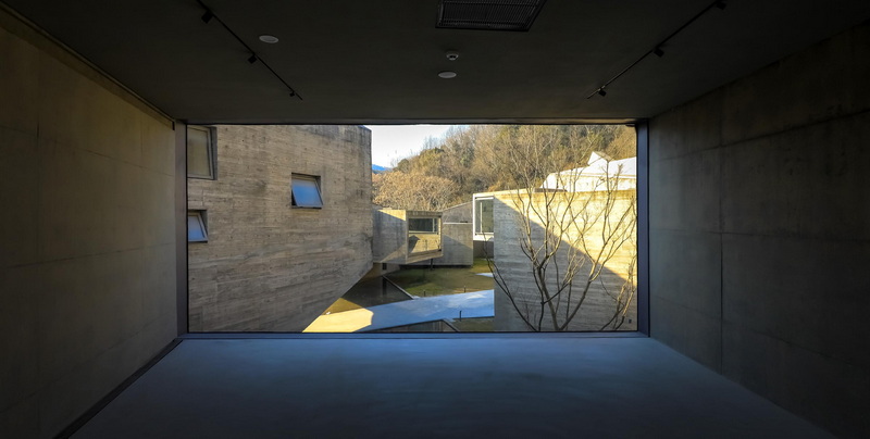 ورودی موزه بهتدریج از دل یک جاده جنگلی پدیدار میشود. بازدیدکنندگان از زیر یک پل طرهای عبور میکنند که حیاطی آرام و ساکن را در مرکز بنا قاب میگیرد. این باغ داخلی، جهتگیری کلی موزه را مشخص میکند؛ سطح آب آن مانند آینهای، سطوح چندوجهی زیر حجمهای بتنی را منعکس میسازد. تجربه حرکت در این فضا با سایهسار کوهستان و خنکای برخاسته از فضاهای زیرین سازه، حس آرامش و پیوستگی با طبیعت را منتقل میکند.