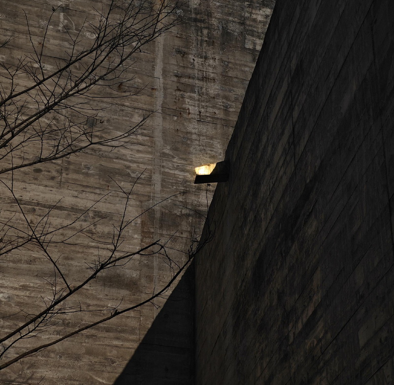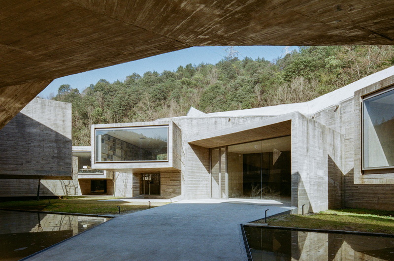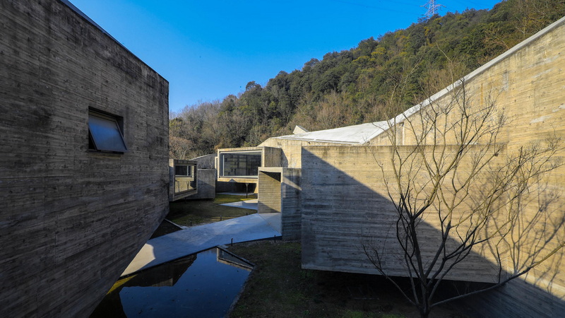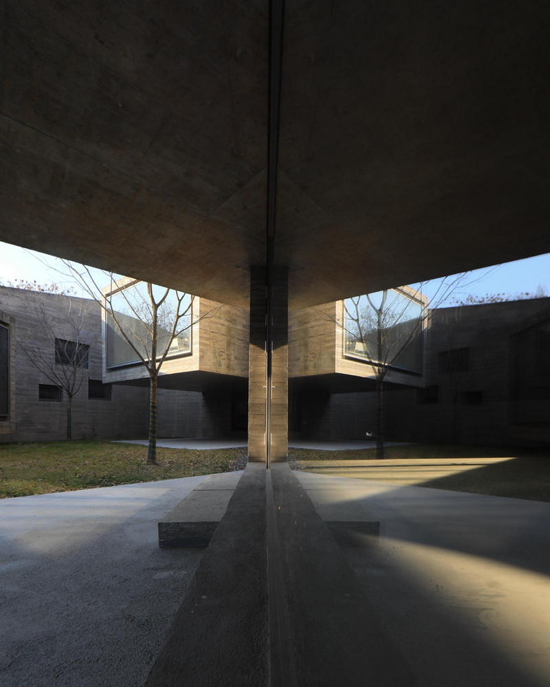 تمام بنا از بتن رنگآمیزیشده با رنگدانهی جوهر سیاه ساخته شده است؛ ترکیبی که به سطوح آن یک تونالیته آرام و شبیه به گرافیت میبخشد و در شرایط نوری مختلف، عمق و غنای بیشتری پیدا میکند. در حیاط مرکزی، استخرهای بازتابنده و سطوح آشکار بتنی یادآور باغهای سنتی چینی هستند که این بار در قالبی مدرن و مینیمال بازآفرینی شدهاند. انعکاس آب عمقی دوچندان به فضا میبخشد و محیط اطراف را در خود تکرار میکند، در حالی که صدای آرام جریان آب، از تیزی و زاویه حجمها میکاهد.