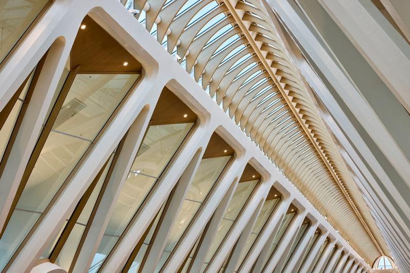 در فضای داخلی، سازه عظیم مثلثی به وضوح دیده میشود. ورودیهای شیشهای به سکوها، فروشگاهها و سایر بخشها، با قوسهای سازهای قاببندی شدهاند. جزئیات چوبی گرمابخش، در ترکیب با کفپوش سنگ آهک آبی، فضایی صمیمی در داخل ایجاد کردهاند. کالاتراوا خاطرنشان میکند: «گالری مرکزی کاملاً محصور و عایقبندی شده است تا در ماههای سرد دمای مناسبی داشته باشد.» بازدیدکنندگان میتوانند از فضای مرکزی از طریق پله، پلهبرقی و آسانسور به سکوها دسترسی پیدا کنند.