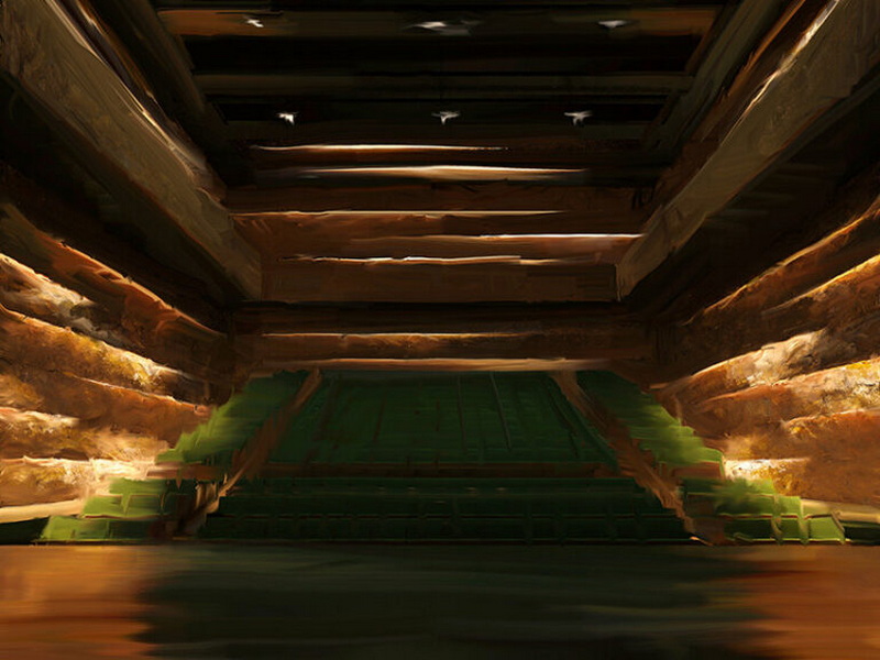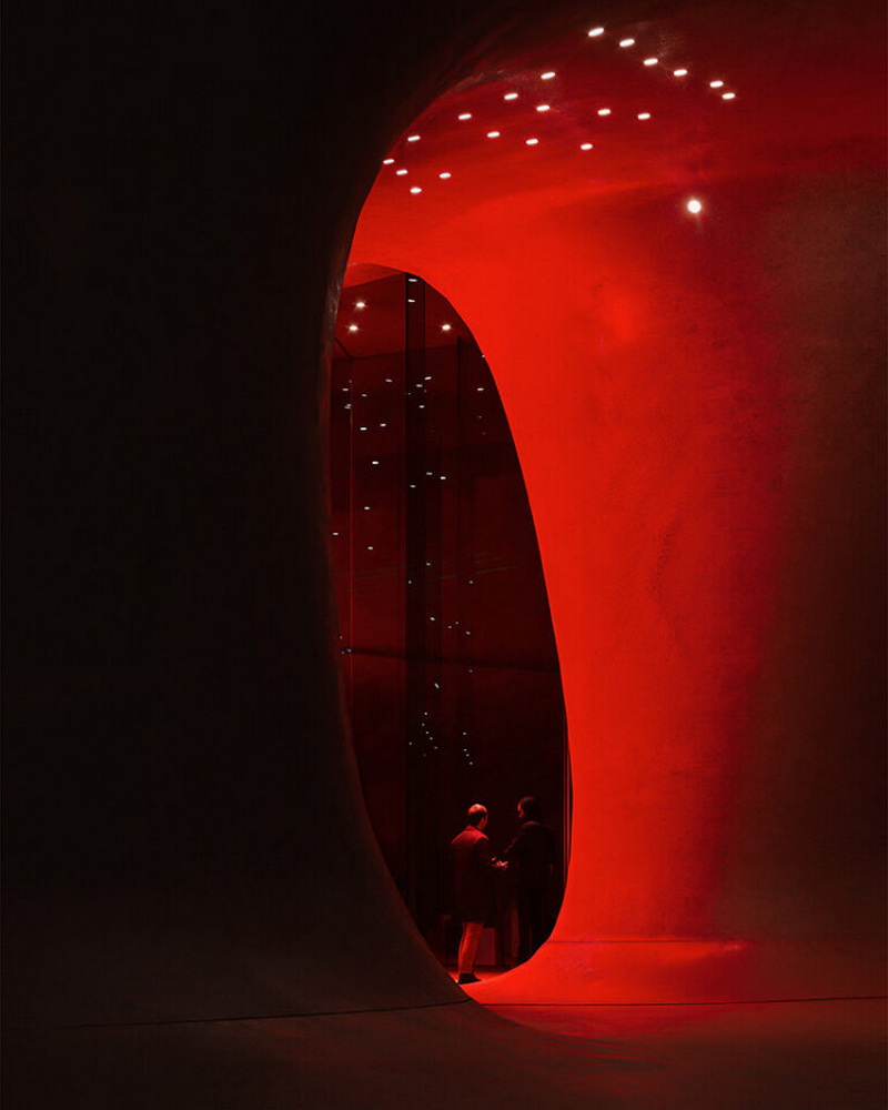 طراحی در طبقه همکف از تأثیرات زمینشناختی رود راین الهام گرفته است. پایه ساختمان شبیه به یک غار است؛ فضایی پیوسته، باز و دعوتکننده با «تخلخل» بالا که از هر طرف امکان ورود و حرکت را میدهد. این لایه بهعنوان یک «عرصه شهری» عمل میکند که حس قلمرو فرهنگی مشترک را تقویت کرده و عموم مردم را تشویق به ورود میکند، حتی زمانی که اجرایی در کار نیست. این گشودگی در تراز همکف، آستانهای تدریجی میان فضای عمومی شهر و جهان اپرا میسازد.